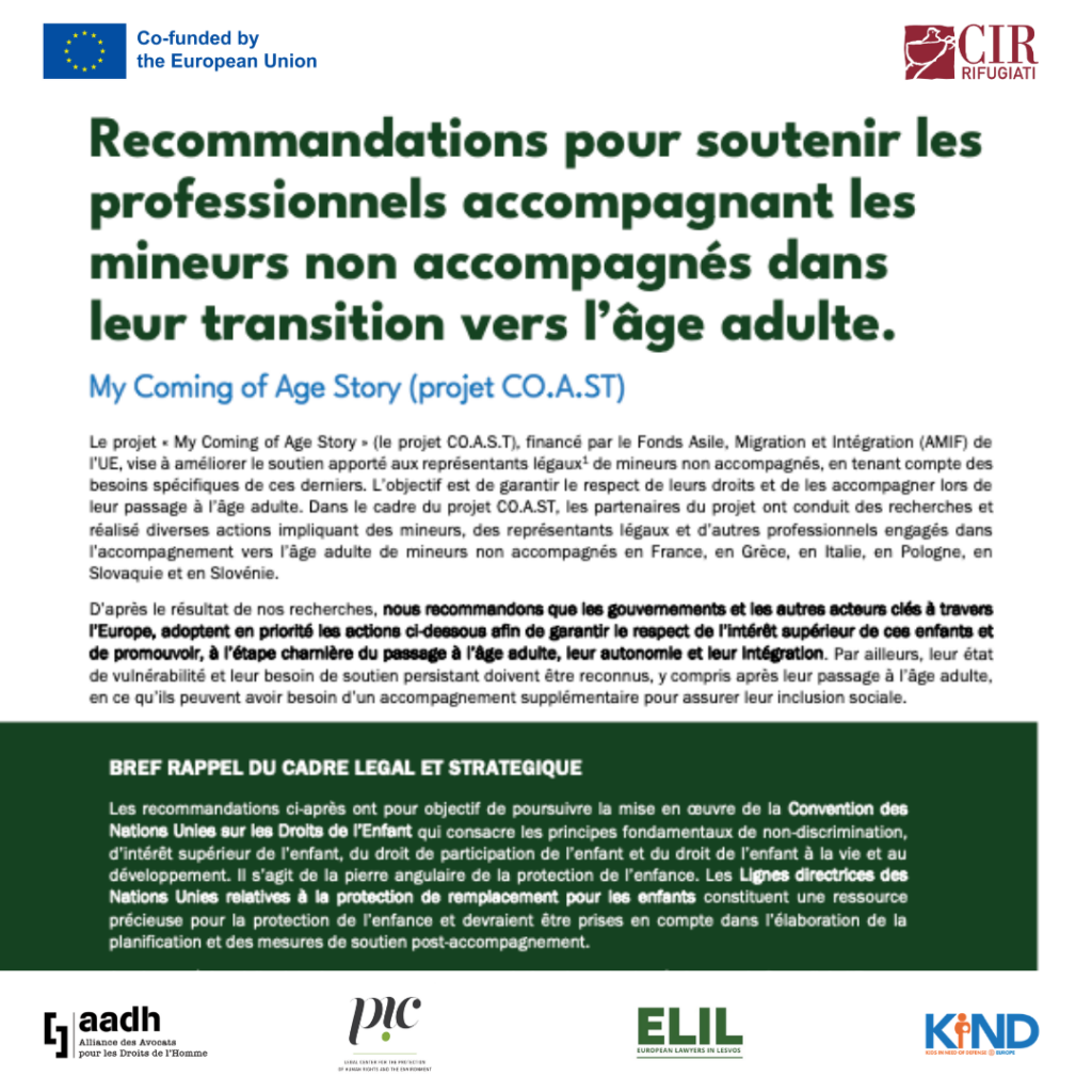 Le projet est cofinancé par la Commission européenne et sa mise en oeuvre est assurée par un consortium d’organisations, dirigé par le CIR – Conseil Italien pour les Réfugiés (Italie), en partenariat avec 4 organisations de 6 États membres : AADH – Alliance des Avocats pour les Droits de l’Homme (France), ELIL – European Lawyers in Lesvos (Grèce et Pologne), KIND – Kids In Need of Defence (Belgique et Slovaquie) et PIC – Pravni Centerza Varstvo človekovih Pravic in Okolja (Centre juridique pour la protection des droits humains et de l’environnement, Slovénie).